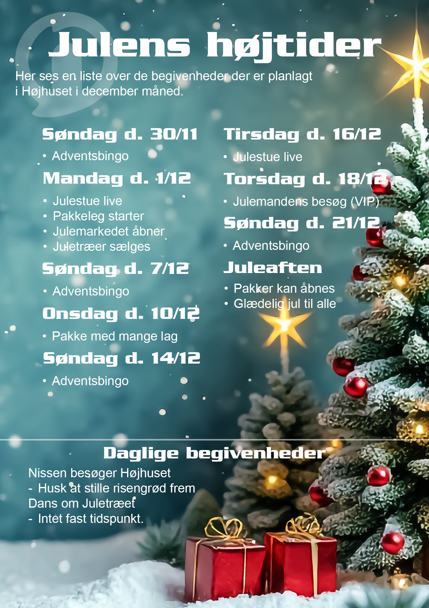 Ud over de faste datoer kan du hver dag opleve små magiske øjeblikke, når nissen besøger Højhuset. Husk risengrøden – man ved aldrig, hvornår den lille fyr dukker op. Der bliver også danset om juletræet på skift, uden fast tidspunkt, så hold godt øje.